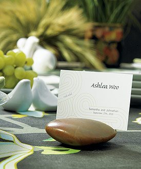 Achieve a Zen-like atmosphere when you incorporate these polished stones into your table settings. Each stone has been etched on one side to accommodate a suitable stationery card. Plan to use these to display place cards, menu cards, or photos. The options are limited only by your imagination. Perfect for garden parties, Asian inspired themes, and weddings planned around a green theme.